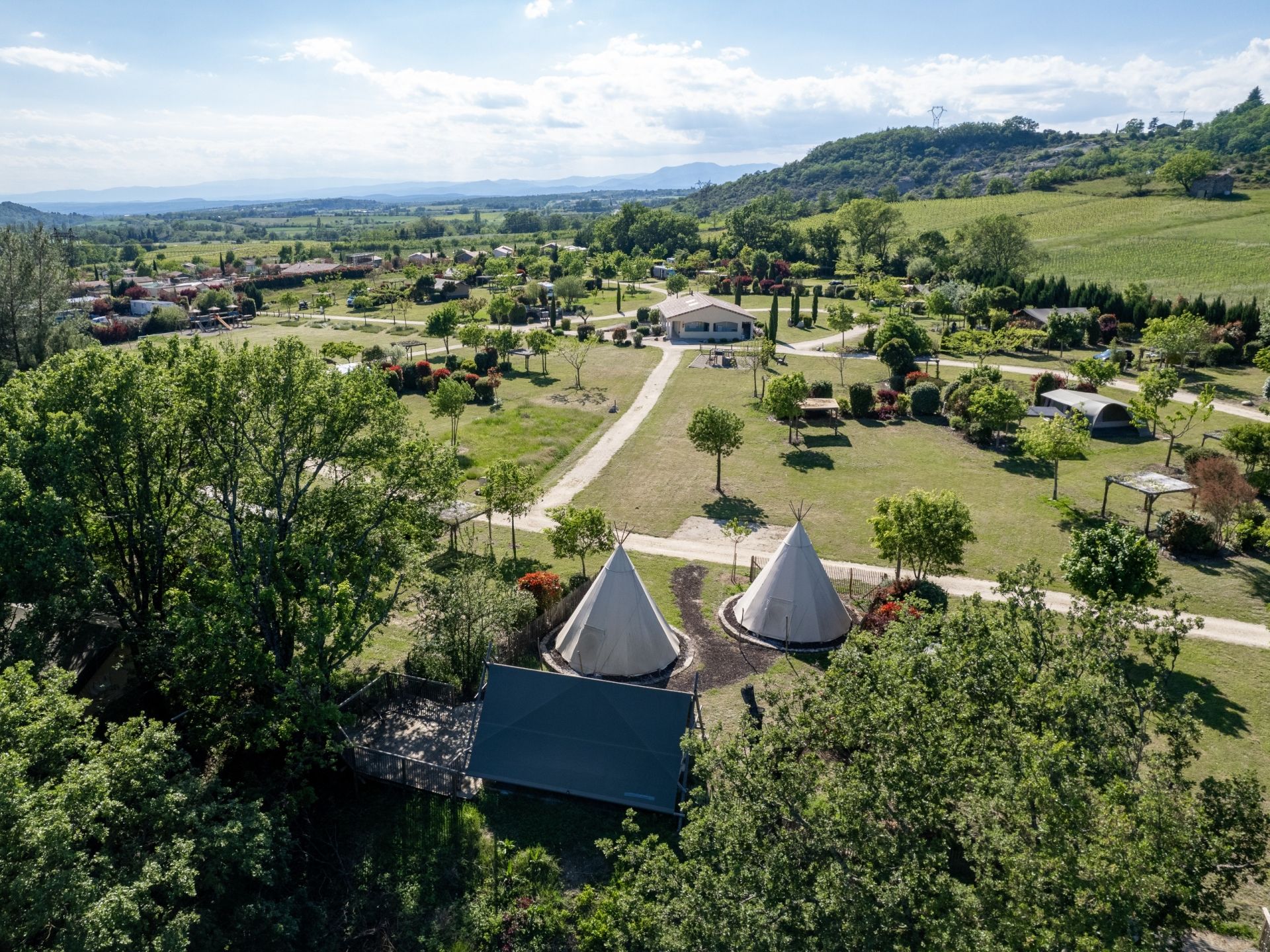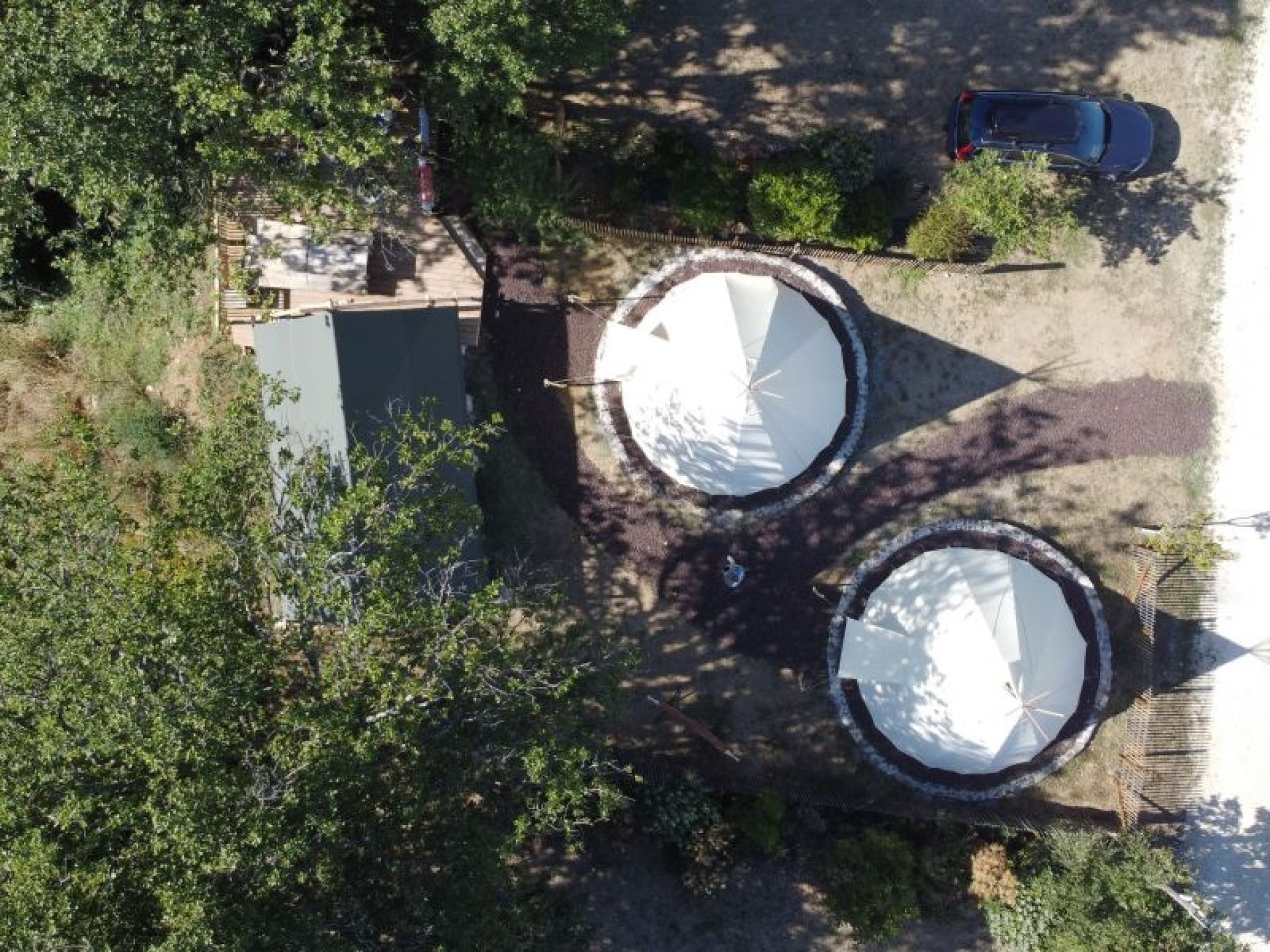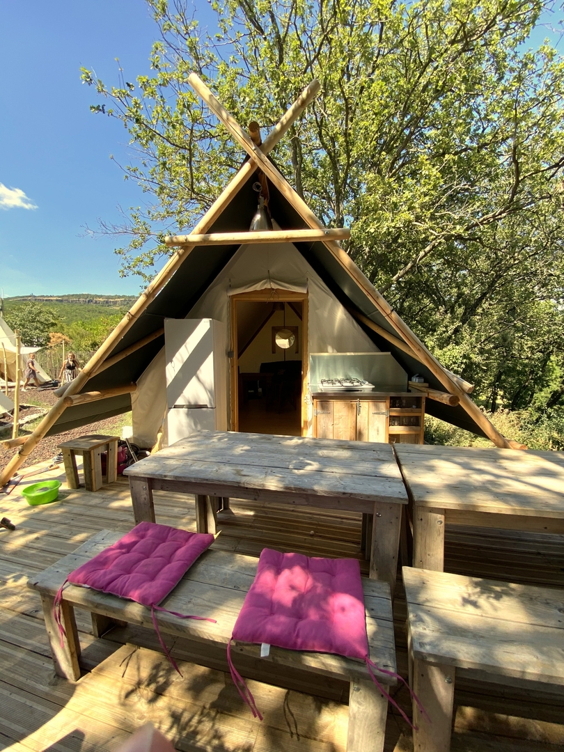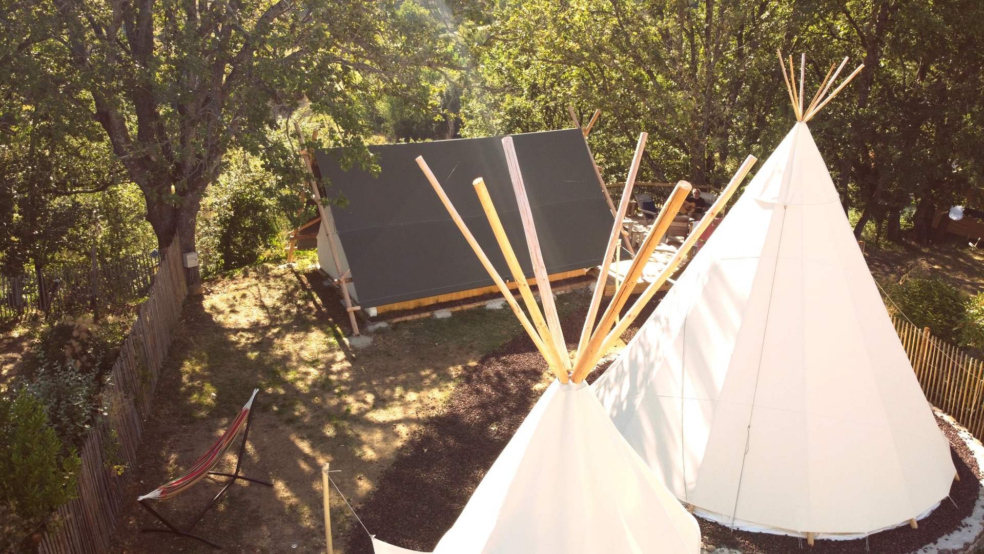 2 tipis + 1 tente prospecteur, le tout implanté sur un espace aménagé de plus de 300 m².