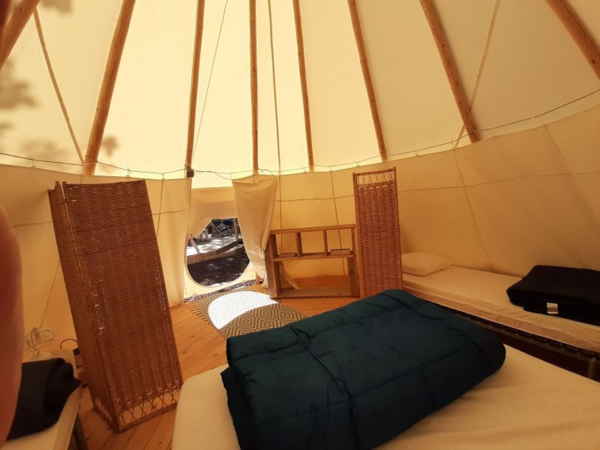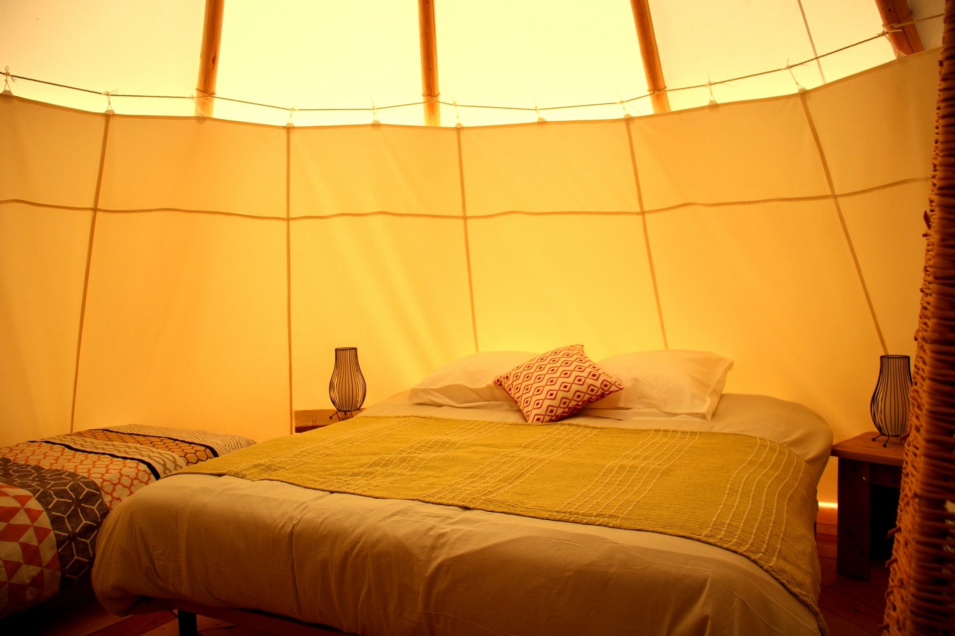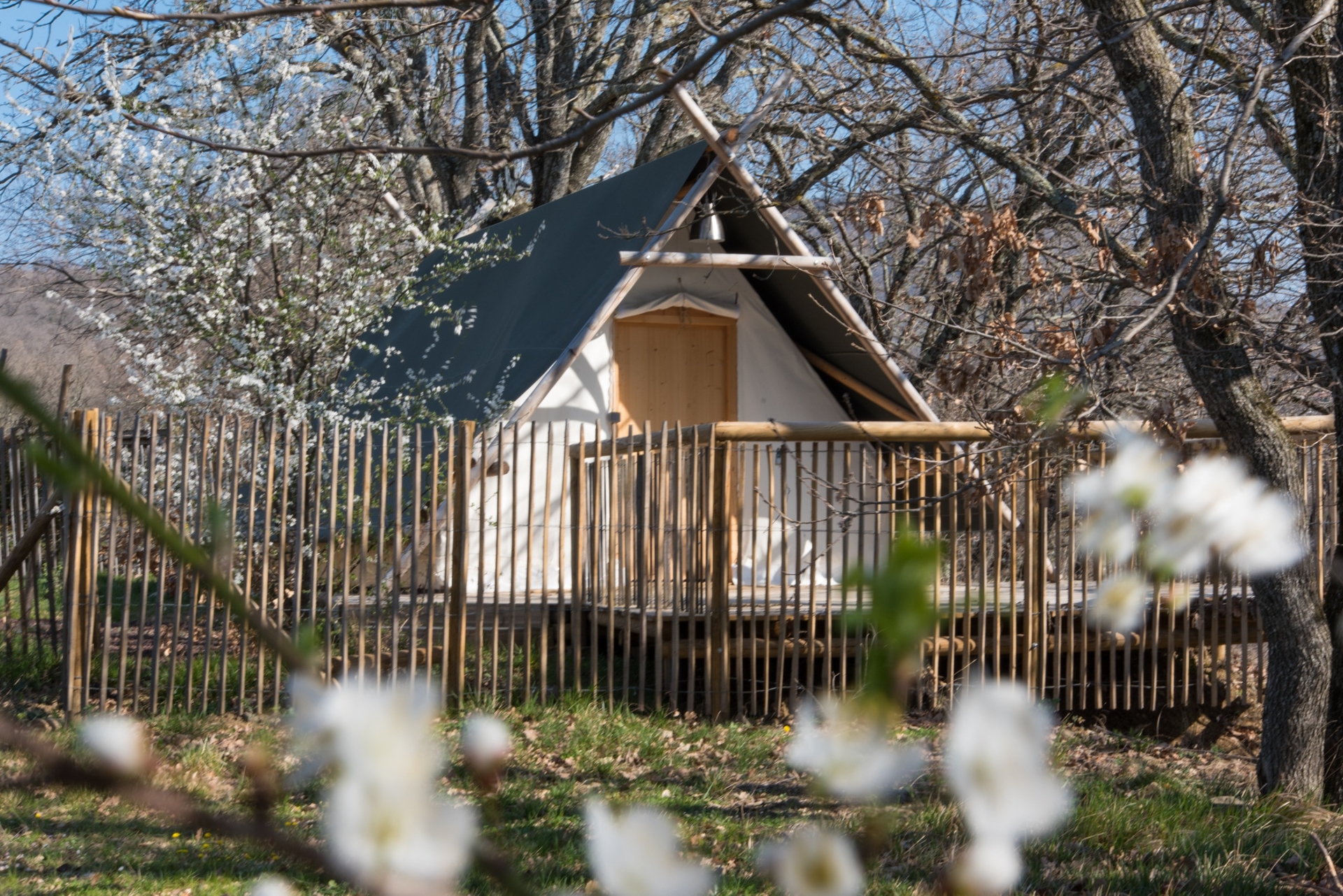 2 tipis + 1 tente prospecteur, le tout implanté sur un espace aménagé de plus de 300 m².
